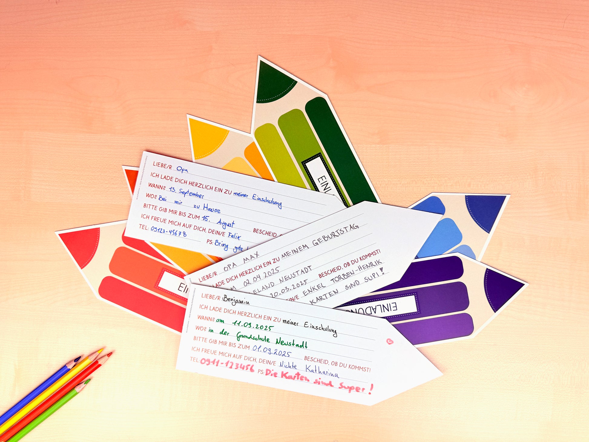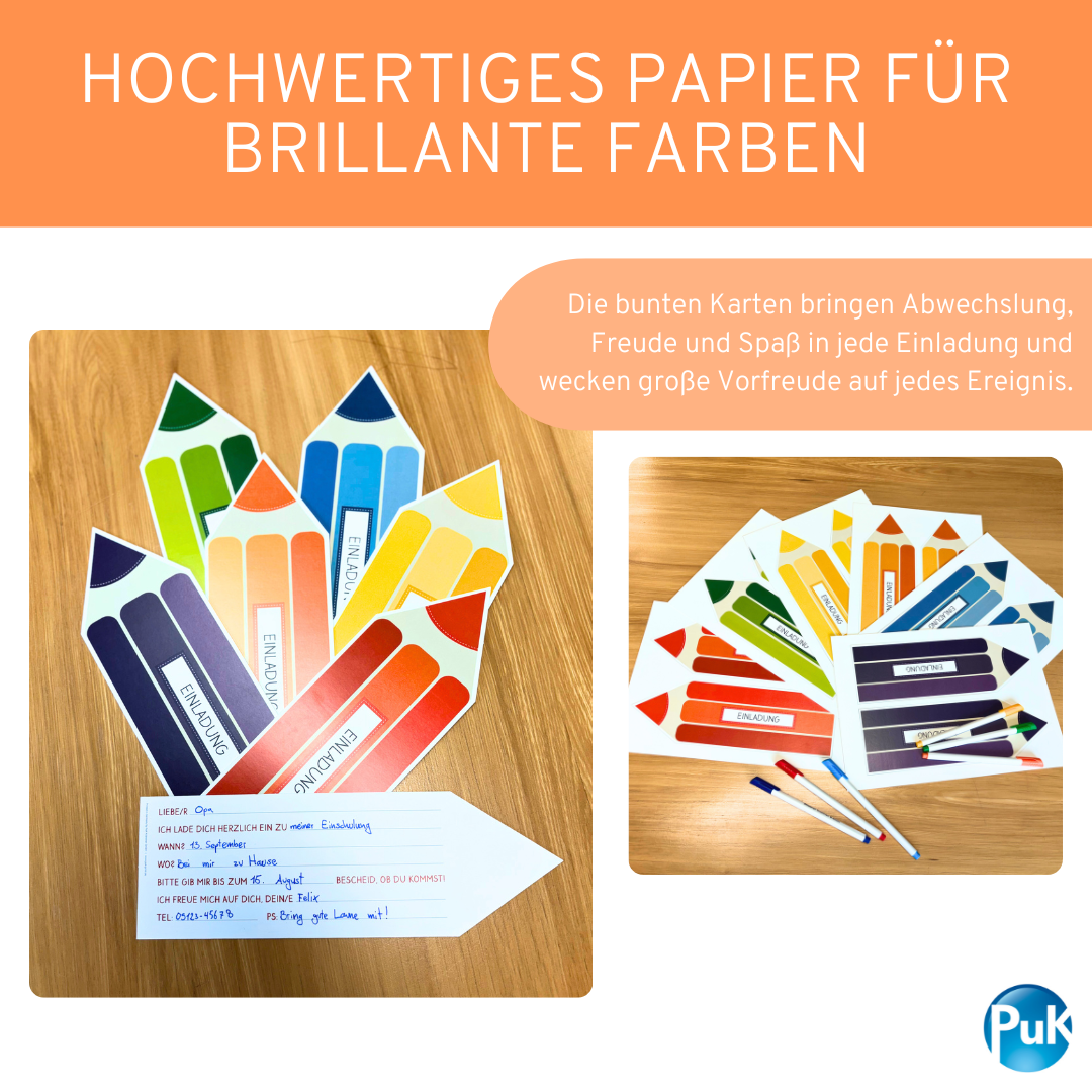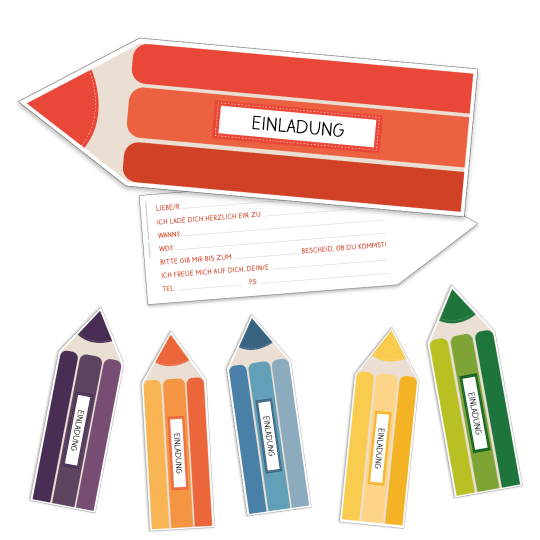 Mit diesen farbenfrohen Buntstift-Einladungskarten wird der Schulstart zu etwas ganz Besonderem! Die originellen Karten in Buntstift-Form begeistern kleine Schulanfänger und sorgen schon vor der Feier für große Vorfreude. Ideal für Einschulung, Schulanfang oder kreative Kindergeburtstage bleiben diese Einladungen garantiert in Erinnerung. Das Set enthält 12 Einladungskarten in 6 leuchtenden Farben, die für eine fröhliche, bunte Mischung sorgen. Dank des vorgedruckten Textfeldes auf der Rückseite können selbst Kinder Datum, Uhrzeit und Ort ganz einfach eintragen. Im extra großen Format von 26 × 8,5 cm bieten die stabilen Karten viel Platz für persönliche Botschaften und überzeugen durch ihr originelles, kindgerechtes Design.