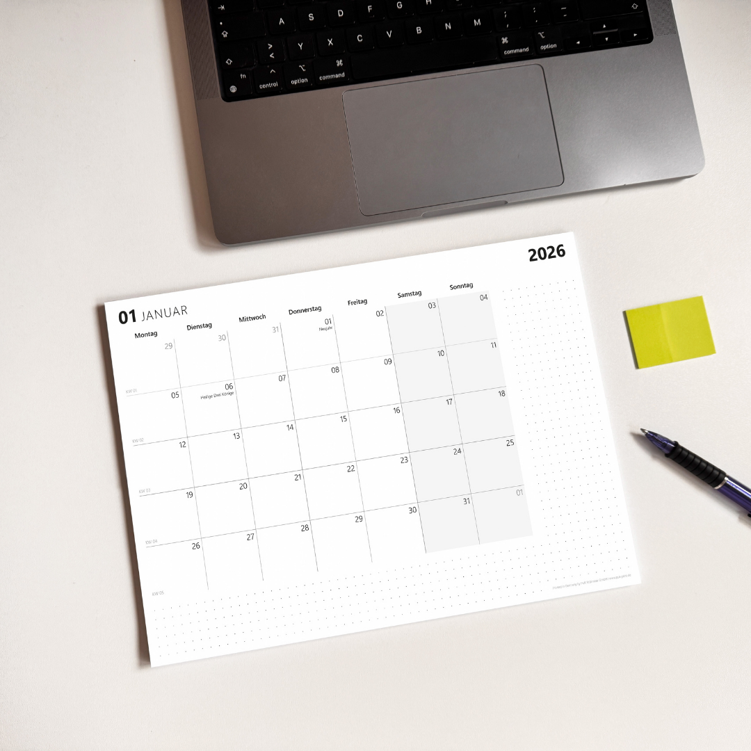 Mit dem Monatsplaner 2026 von PuK startest du organisiert und entspannt ins neue Jahr! Jeder Monat von Januar bis Dezember ist übersichtlich auf einer Seite dargestellt – inklusive Kalenderwochen und bundesweiter Feiertage. Die großzügigen Kästchen bieten viel Platz für Termine, Notizen und wichtige Erinnerungen. Erhältlich in DIN A4 oder DIN A3, passt der Planer perfekt auf jeden Schreibtisch. Dank der praktischen Blockbindung kannst du die Monatsblätter einfach abreißen. Gedruckt auf hochwertigem, schnell trocknendem Offsetpapier bleibt alles sauber und klar. Das schlichte Schwarz-Weiß-Design sorgt für eine stilvolle, minimalistische Optik – ideal für Büro, Homeoffice oder Zuhause.
