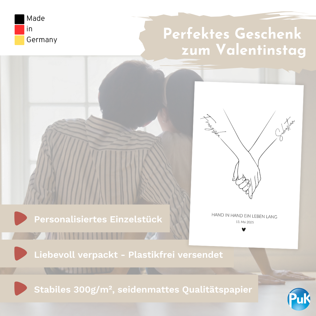Personalisiertes Pärchen Poster im minimalistischen Line Art Stil – zwei Hände, die sich halten, kombiniert mit euren Namen & Datum. Dieses schlichte Liebesposter ist eine zeitlose Erinnerung an eure Verbindung und passt perfekt als moderne Wanddeko ins Schlafzimmer, Wohnzimmer oder als liebevolles Geschenk für Paare.