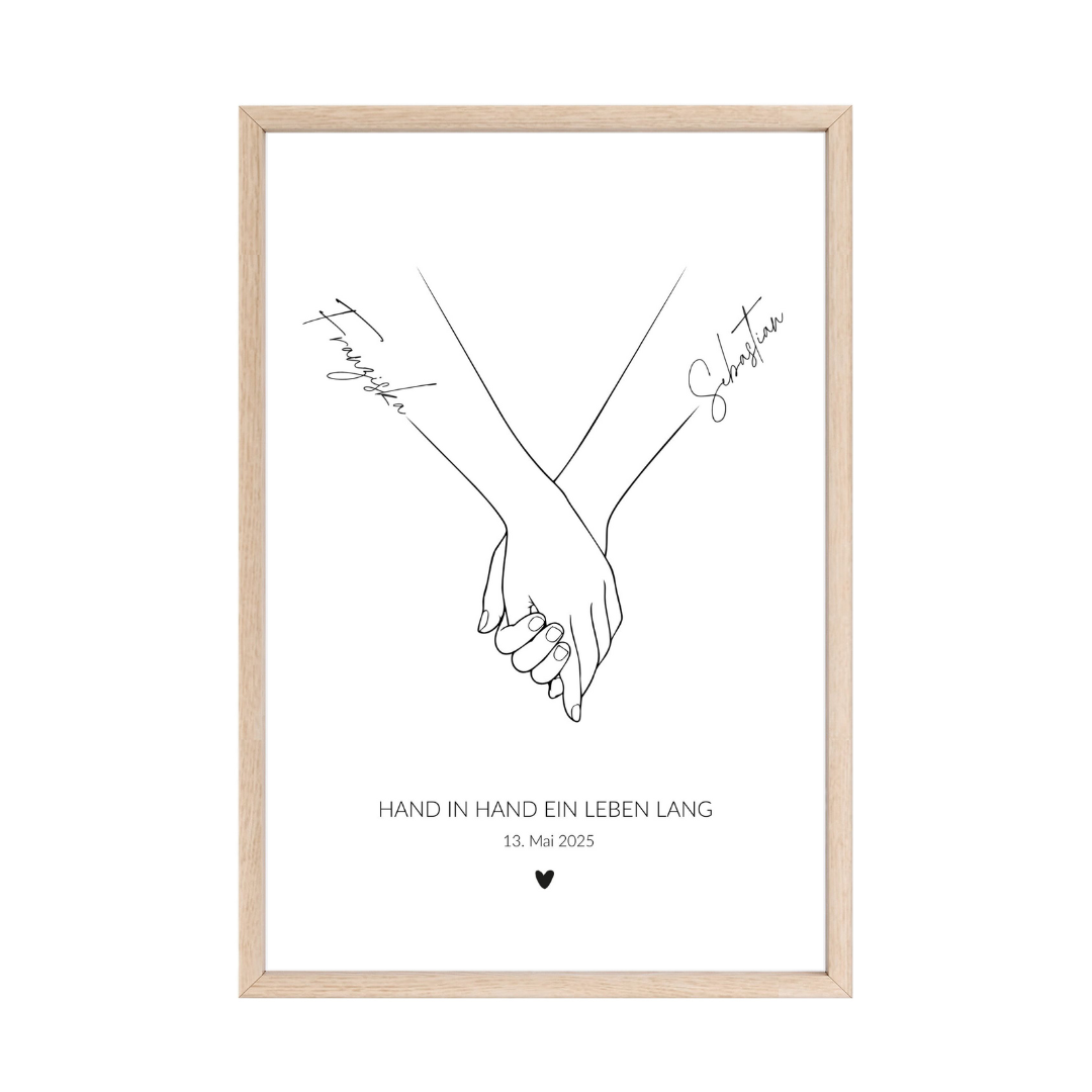 Dieses minimalistische Poster zeigt in einer eleganten Line-Art-Zeichnung zwei Hände, die sich halten – als stilles Symbol für Liebe, Vertrauen und Zusammenhalt. Ein ruhiger, emotionaler Blickfang, der sich harmonisch in jedes Zuhause einfügt.