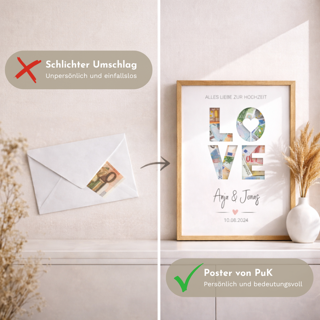 🎁 EINZIGARTIGES GELDGESCHENK: Hochwertiges Poster mit Cut-Out für stilvolle Platzierung von Geldscheinen - das perfekte Geldgeschenk zur Hochzeit.