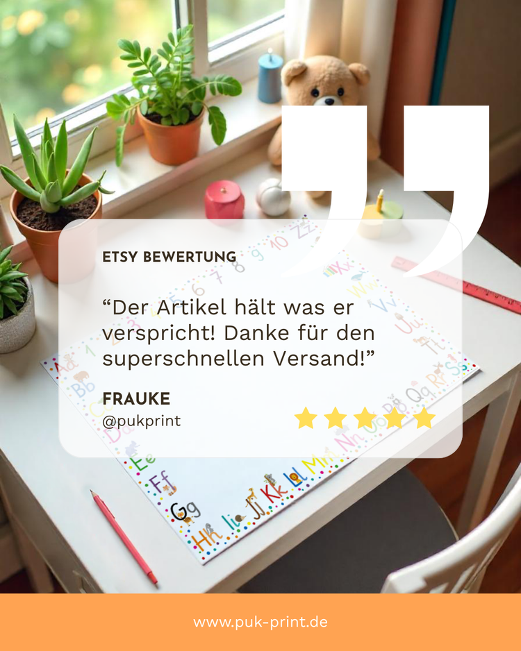 Die Schreibunterlage entspricht genau meinen Vorstellungen.Versand superschnell.Man kann über das PuK-Team im Nürnberger Land wirklich nicht meckern :-)